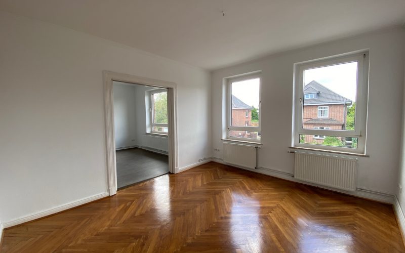 Dieser Raum beinhaltet zwei Brüstungsfenster, die aufgrund der 2,90 m hohen Decken, sehr großflächig ausfallen und viel Licht in den Wohnbereich bringen.