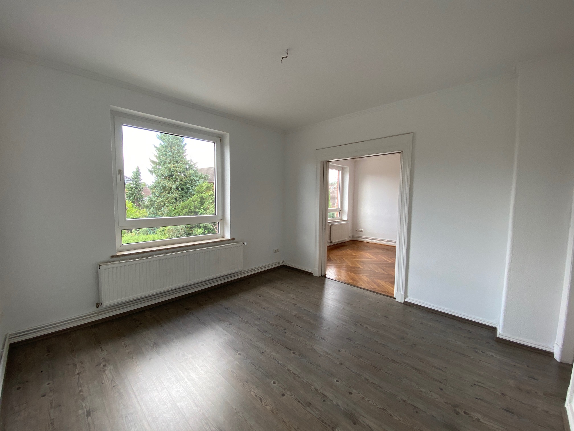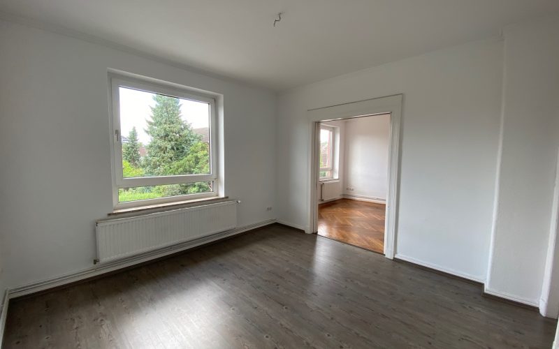 Der Wohnbereich erstreckt sich über zwei Räume, der durch eine hübsche, in der wandlaufende 2-teilige Schiebetür, voneinander abtrennbar ist.
