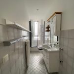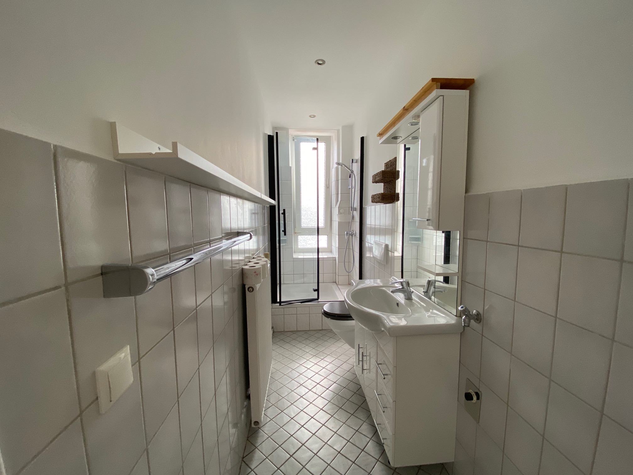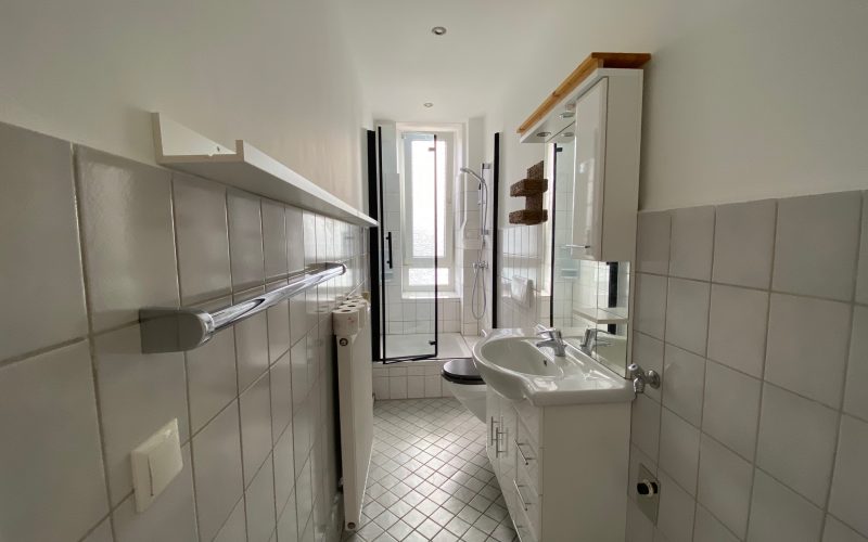 Das Badezimmer ist mit weißen Fliesen versehen und verfügt über einen Waschtisch, ein WC mit Unterputz-Spülkasten und eine Dusche.